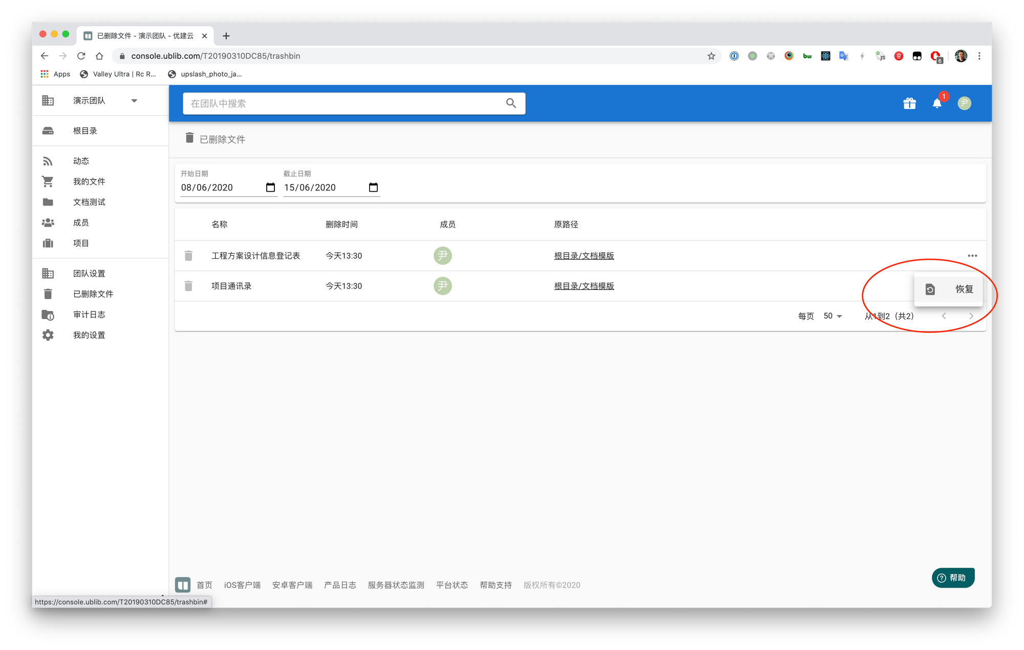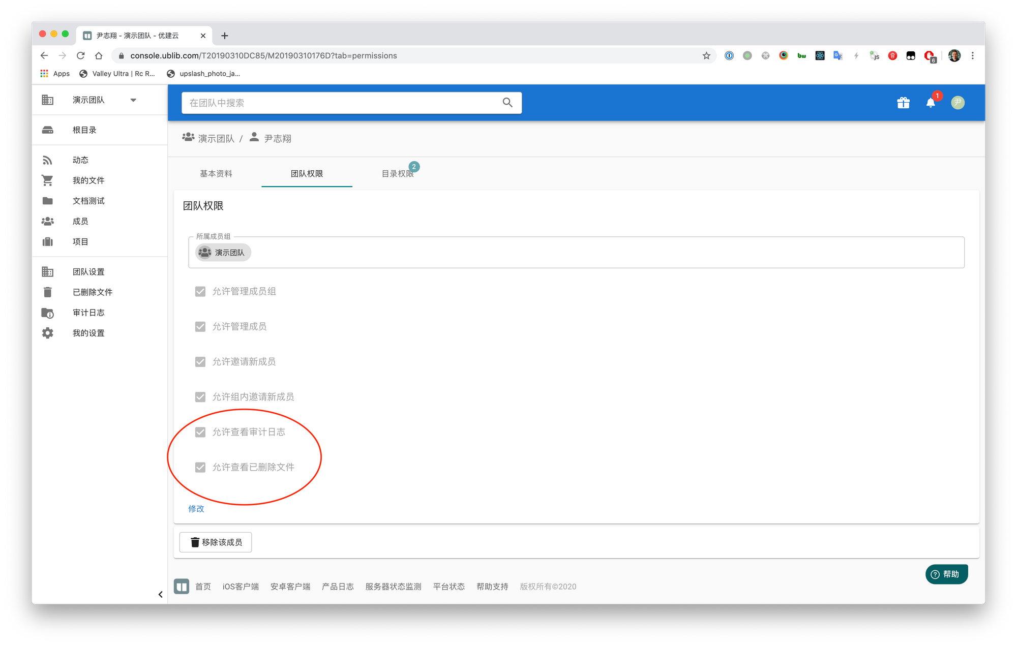 系统内的“用户权限”中增加了两个新项目“允许查看审计日志”和“允许查看已删除文件”,团队所有者会自动拥有这些权限,并可以允许其他团队成员拥有这些权限。