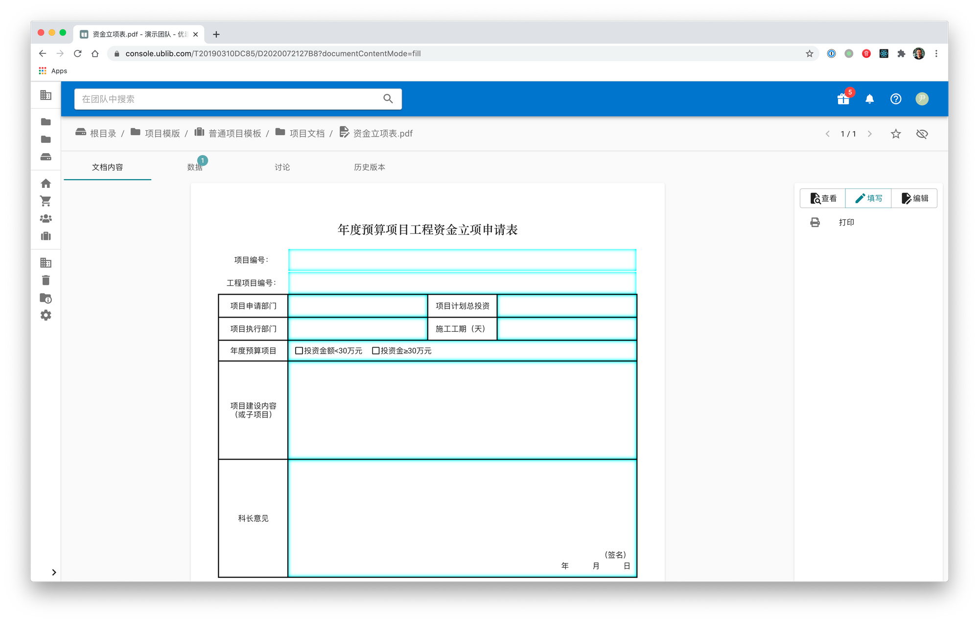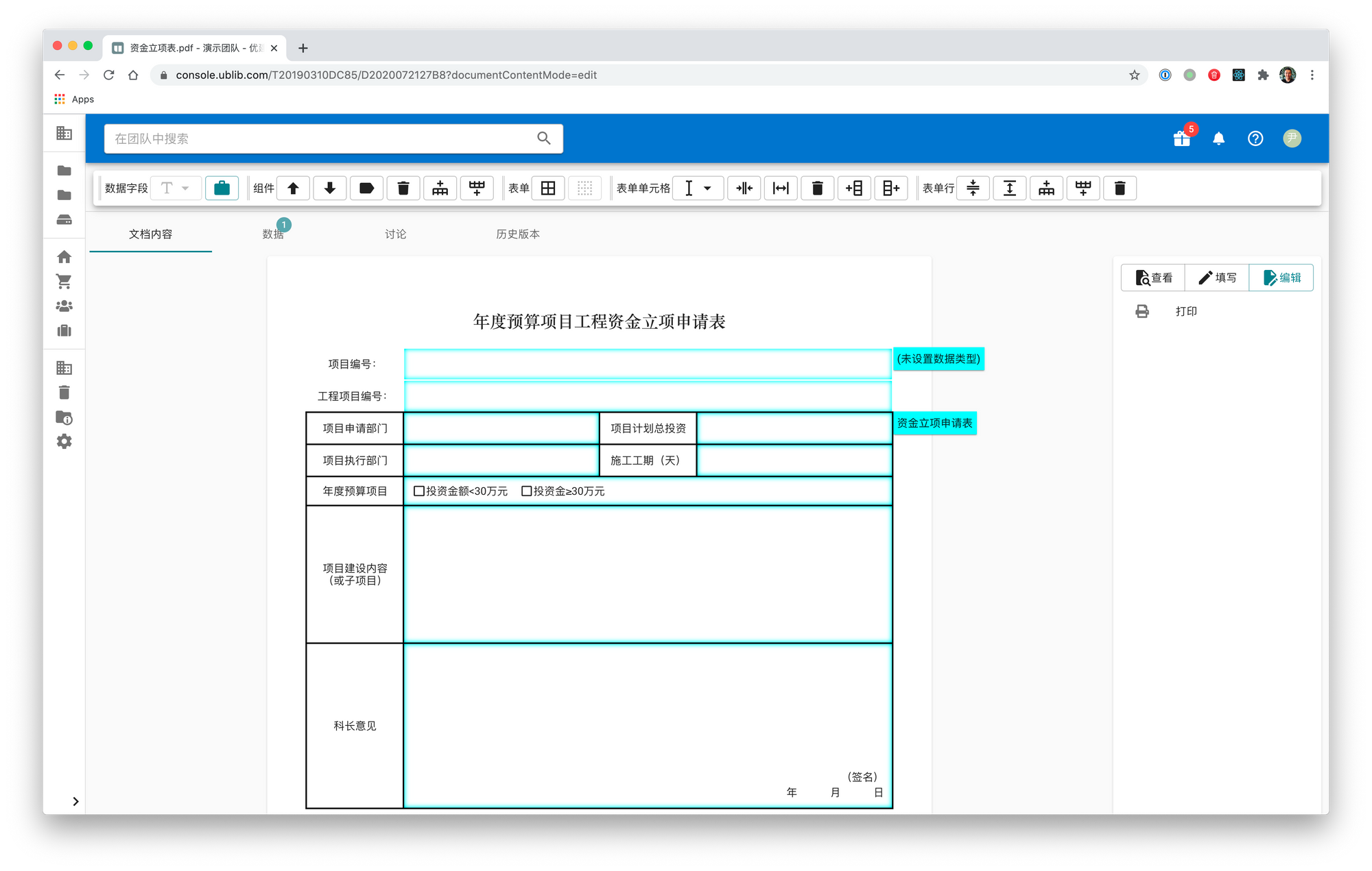 2020年7月27日 1 min read 200727 隐藏表单边框 我们现在在表单内加入了一个选项可以隐藏整个表单的边框,利用这个功能可以设置看起来像普通文字但显示在真实表单之外的数据域。例如在以下“资金立项申请表”内,“项目编号”和“工程项目编号”不属于本表的内容但是是项目的全局属性,需要显示在边框之外,我们可以在主表单之前插入一个新的表单仅包含着两个字段,然后将其边框设置为隐藏。编辑时将两部分分开为不同的表单,然后设置顶部的表单边框为隐藏查看模式的效果填写模式的效果 Enjoying these posts? Subscribe for more Subscribe now Already have an account? Sign in