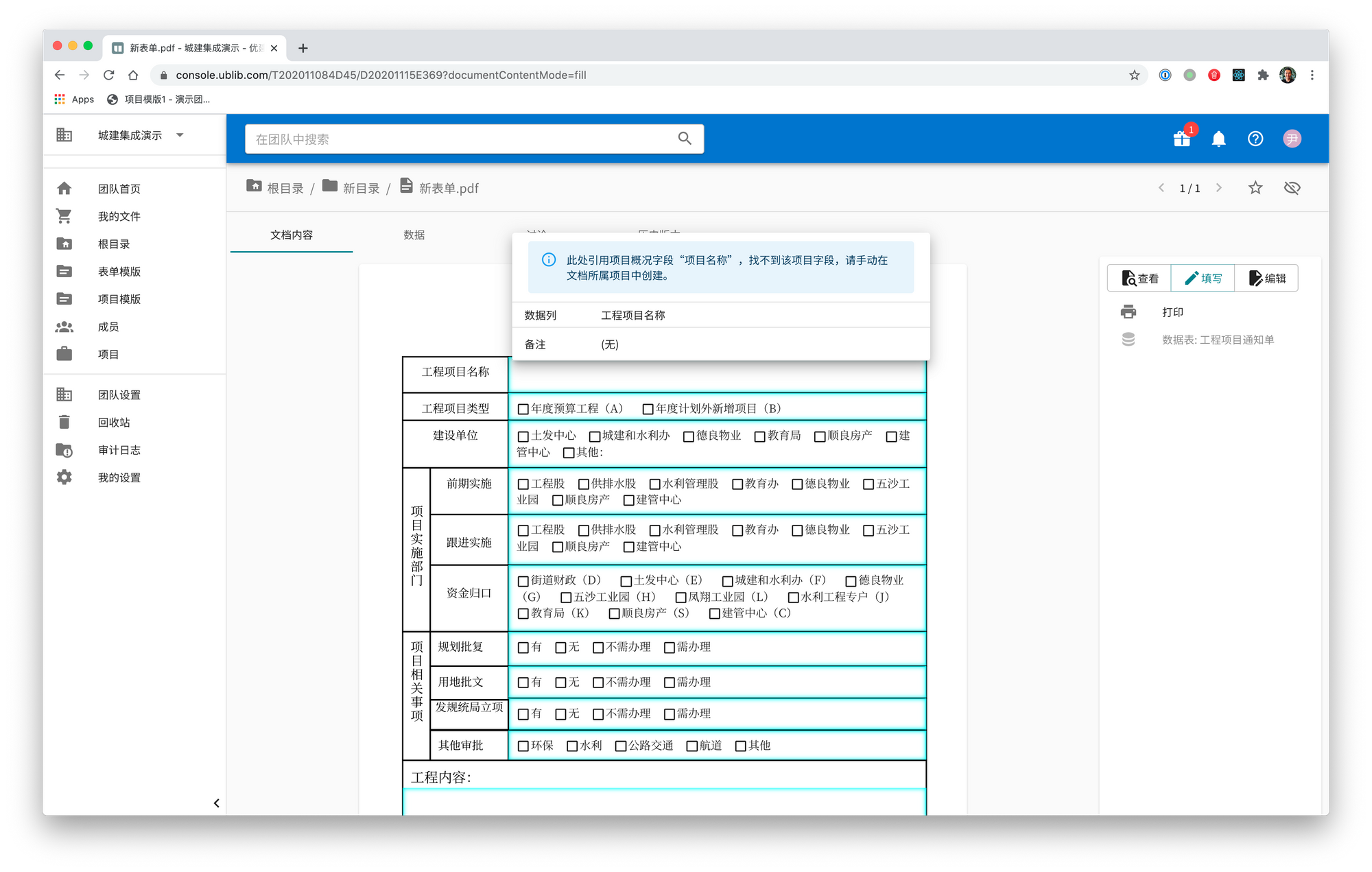 2020年11月16日 1 min read 201116 引用项目字段的提示 我们在文档字段悬浮窗中加入了引用项目字段的提示,这样在填写时可以更明显地提示操作人该字段的实际储存位置。如果引用的项目字段存在,则会提示操作人如需更改到所在项目的概况里操作。如果字段设置了引用,但所在项目里不存在对应字段,或表单未放置于项目内,则会显示找不到相应字段,请手动创建。 Enjoying these posts? Subscribe for more Subscribe now Already have an account? Sign in