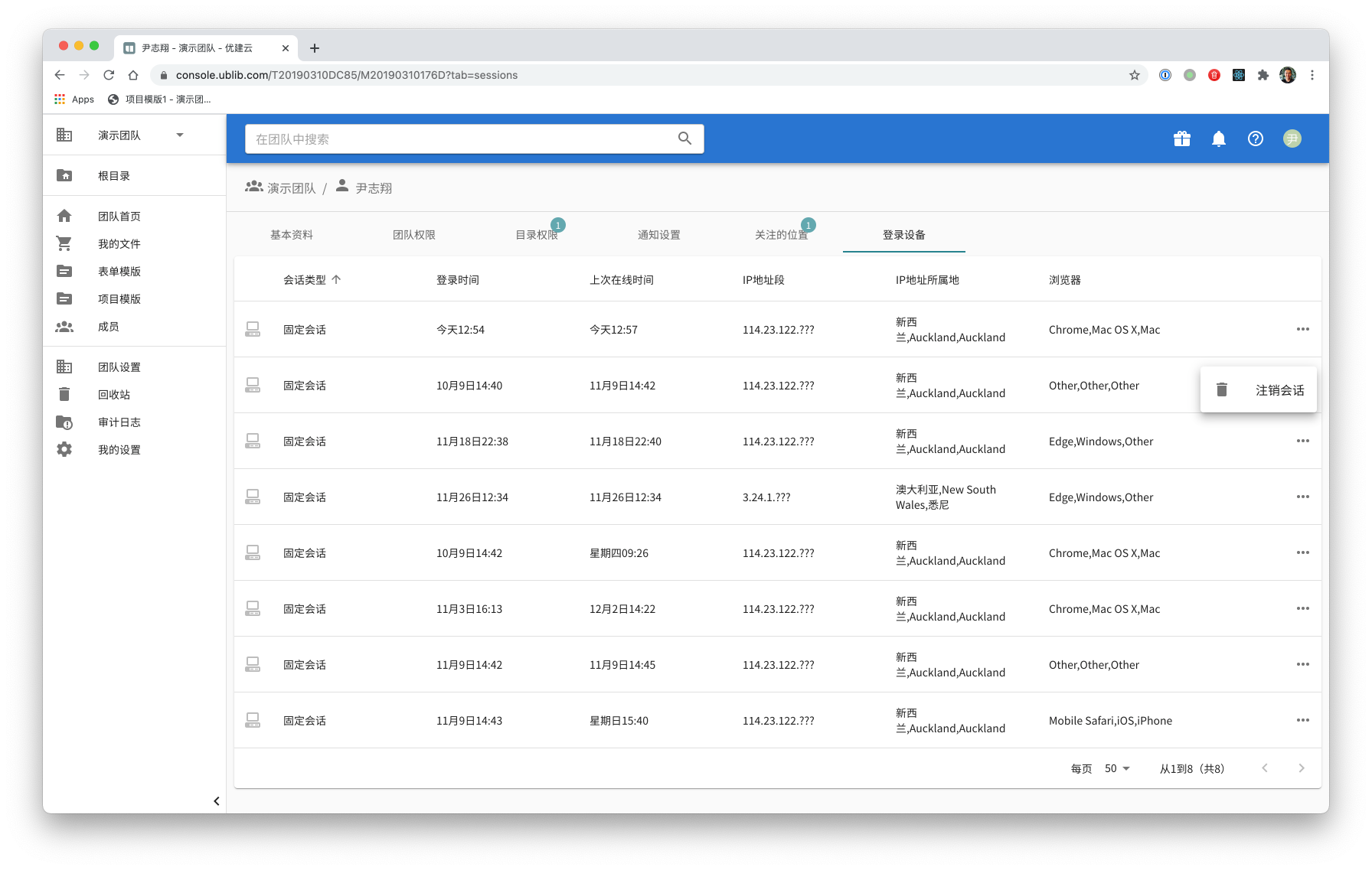 本次更新我们加入了一些功能以增强系统的安全,首先是审查和撤销登录会话的界面。成员可以自行查看和管理自己的所有登录会话,包括在线时间,IP地址段等信息。