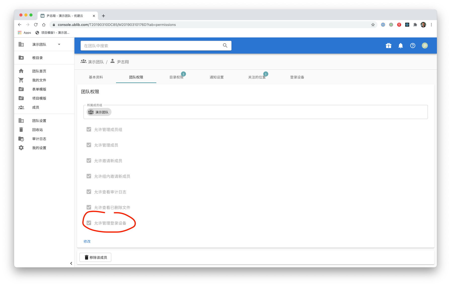 另外用户的权限中增加了“允许管理登录设备”一项,默认为关闭,开启后将可以审查和管理团队内所有成员的登录会话。