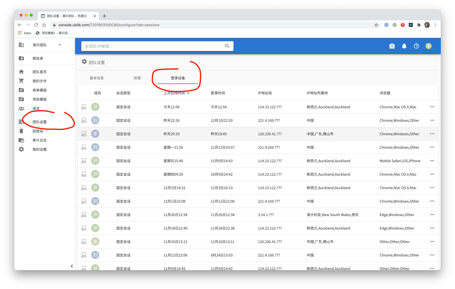 拥有该权限的管理员还可以在列出团队内的所有登录设备,进行审查。
