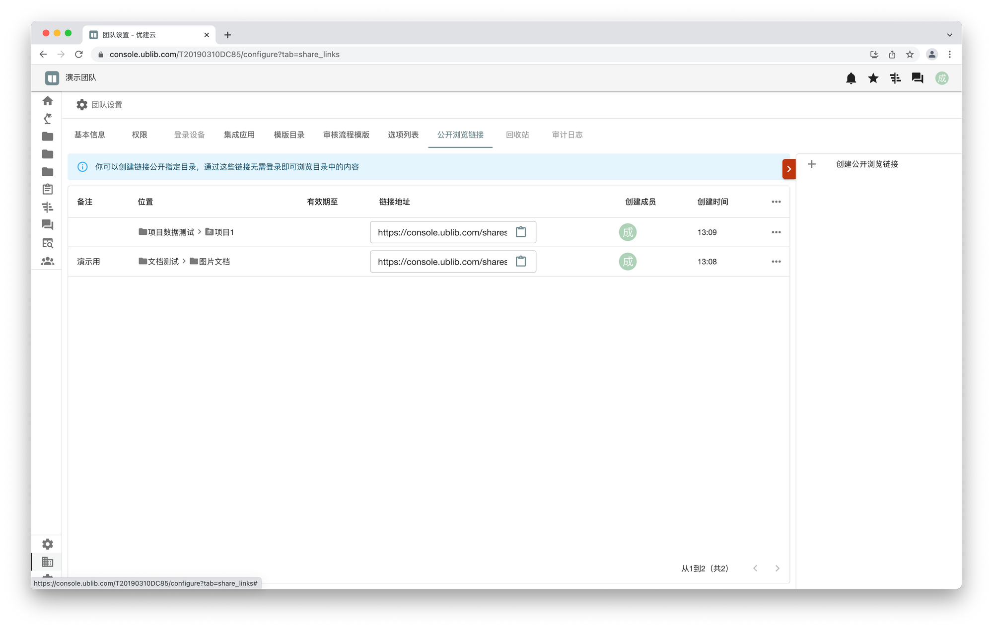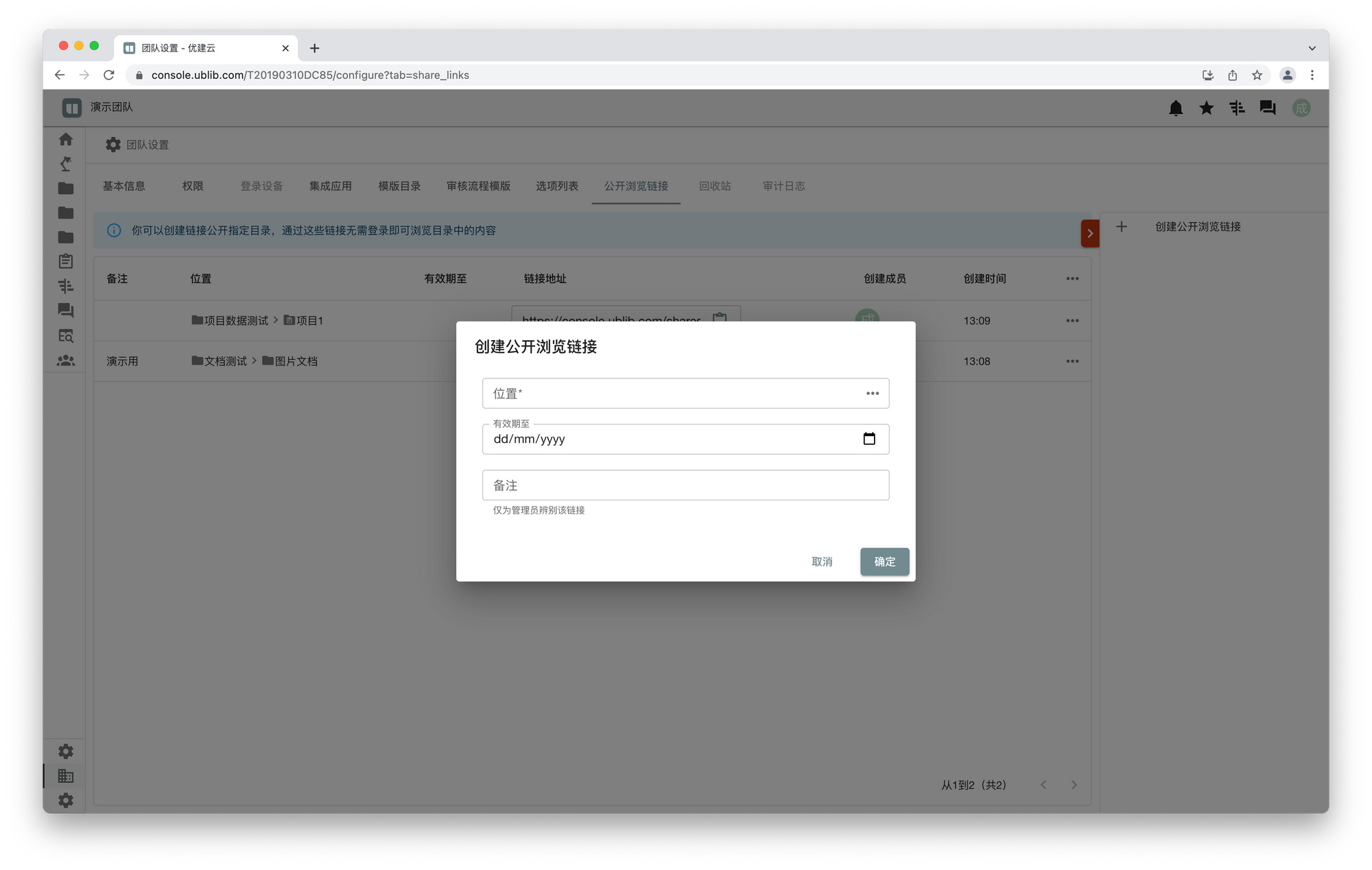 公共浏览链接在团队设置里管理,需要专门的管理公共浏览链接权限。创建链接时可以设置一个备注,并可以设置可选的有效期。