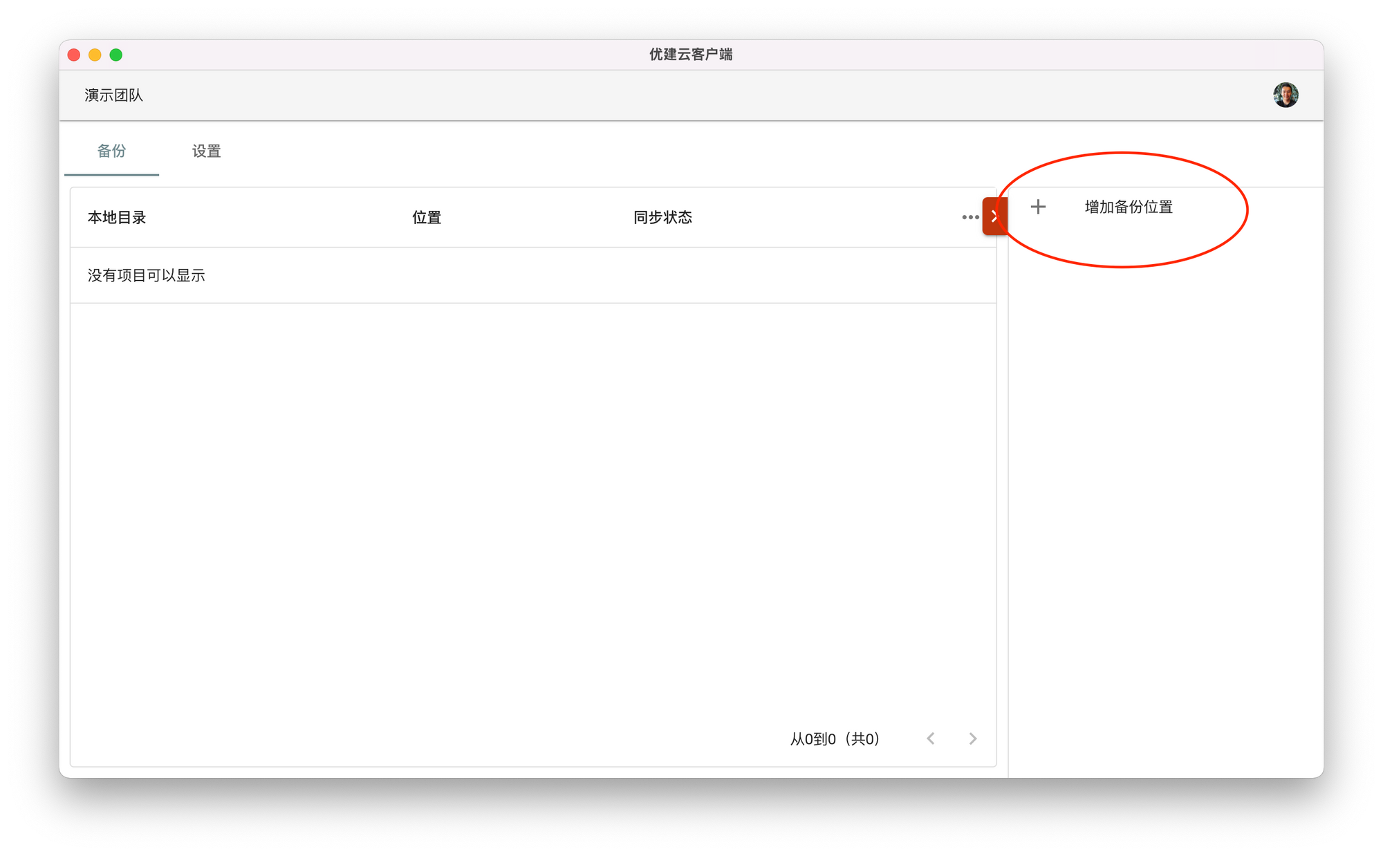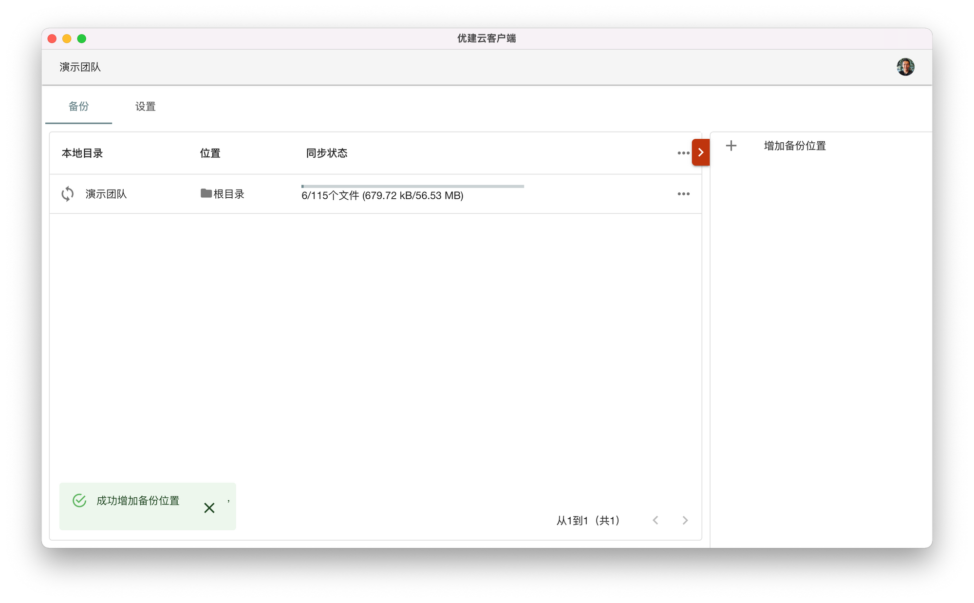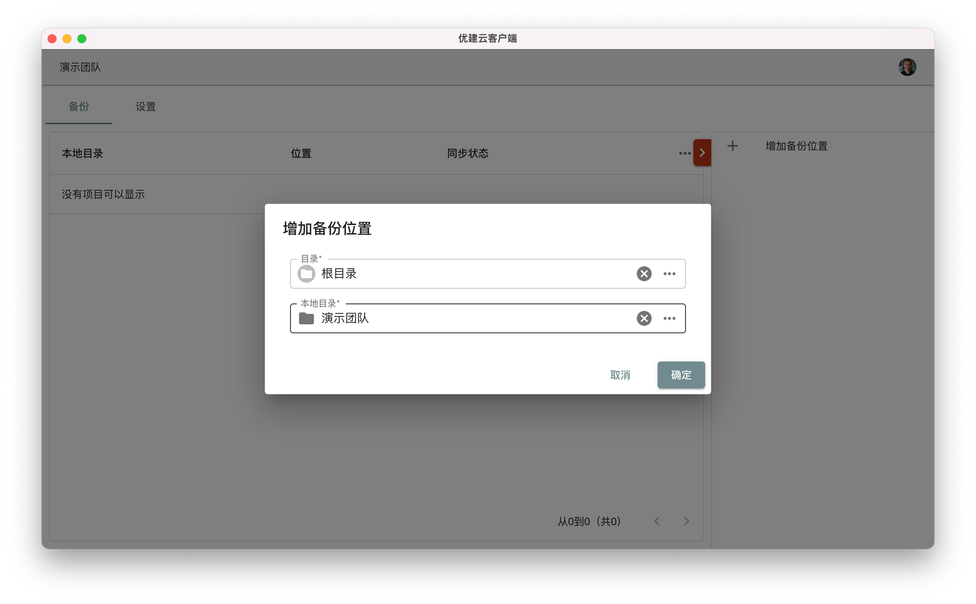 您可以设置将多个团队内的目录位置同步到本地目录,点击增加备份位置进行设置。