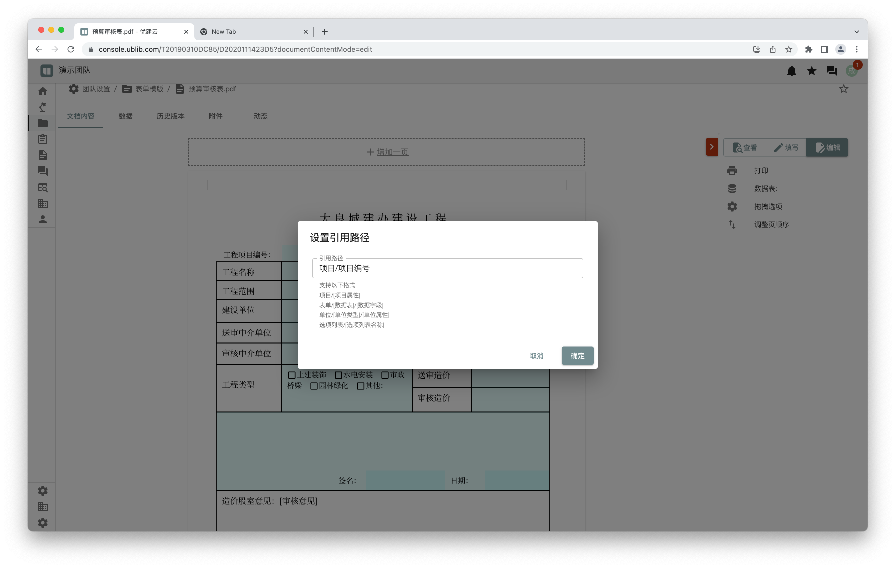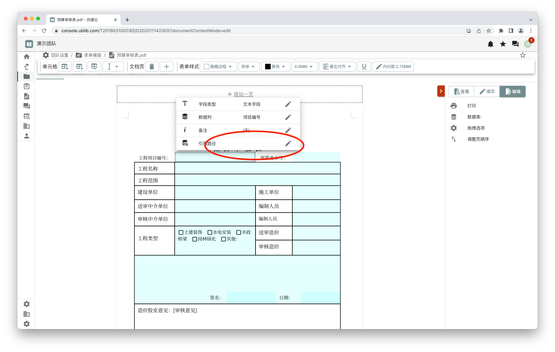 在表单或表单模版的编辑模式下,可以设置数据字段的引用路径: