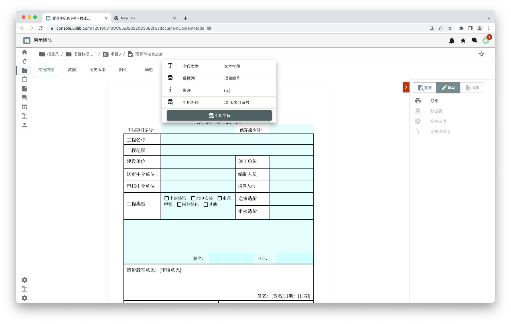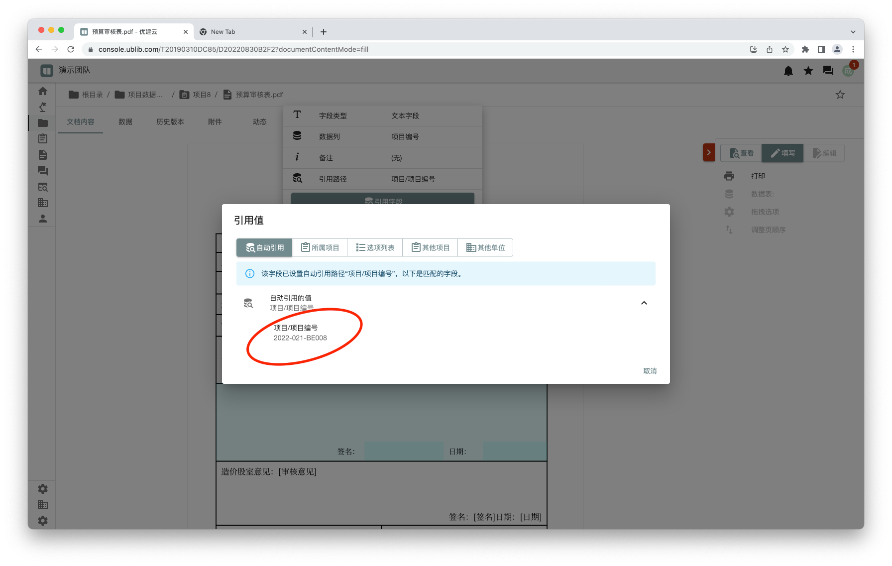 填写表单时可以快速引用到指定的路径,例如,如果指定字段引用项目/项目标号,则填写时会显示该字段有已有的引用路径。
