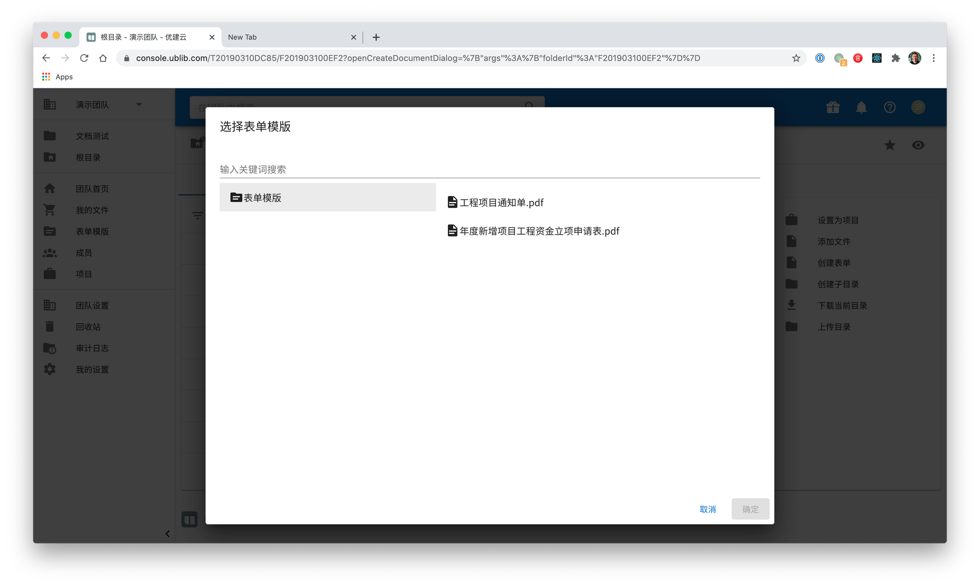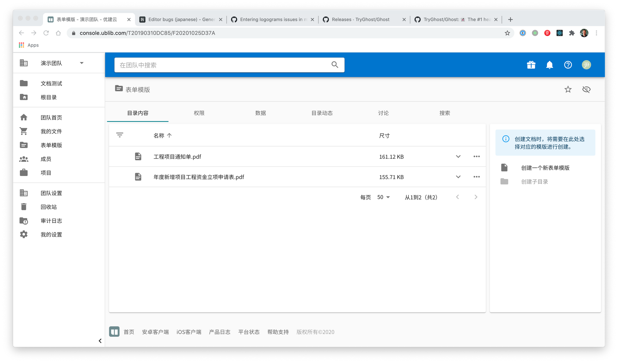我们增加了一个团队的特殊目录“表单模版”用于存放新建表单时使用的模版,该目录与“根目录”一样,属于团队的顶级目录。该目录里只能创建表单模版和子目录(用于分类不同的表单模版)。