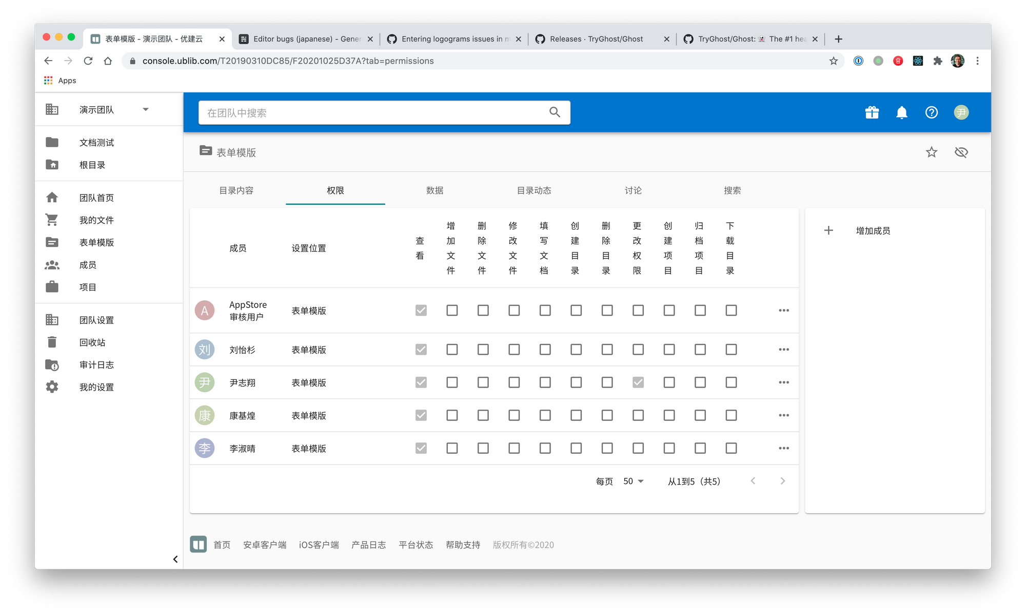 对于表单模版目录,所有团队成员都有读取权限,团队所有者可以赋予写入修改的权限给其他成员。5